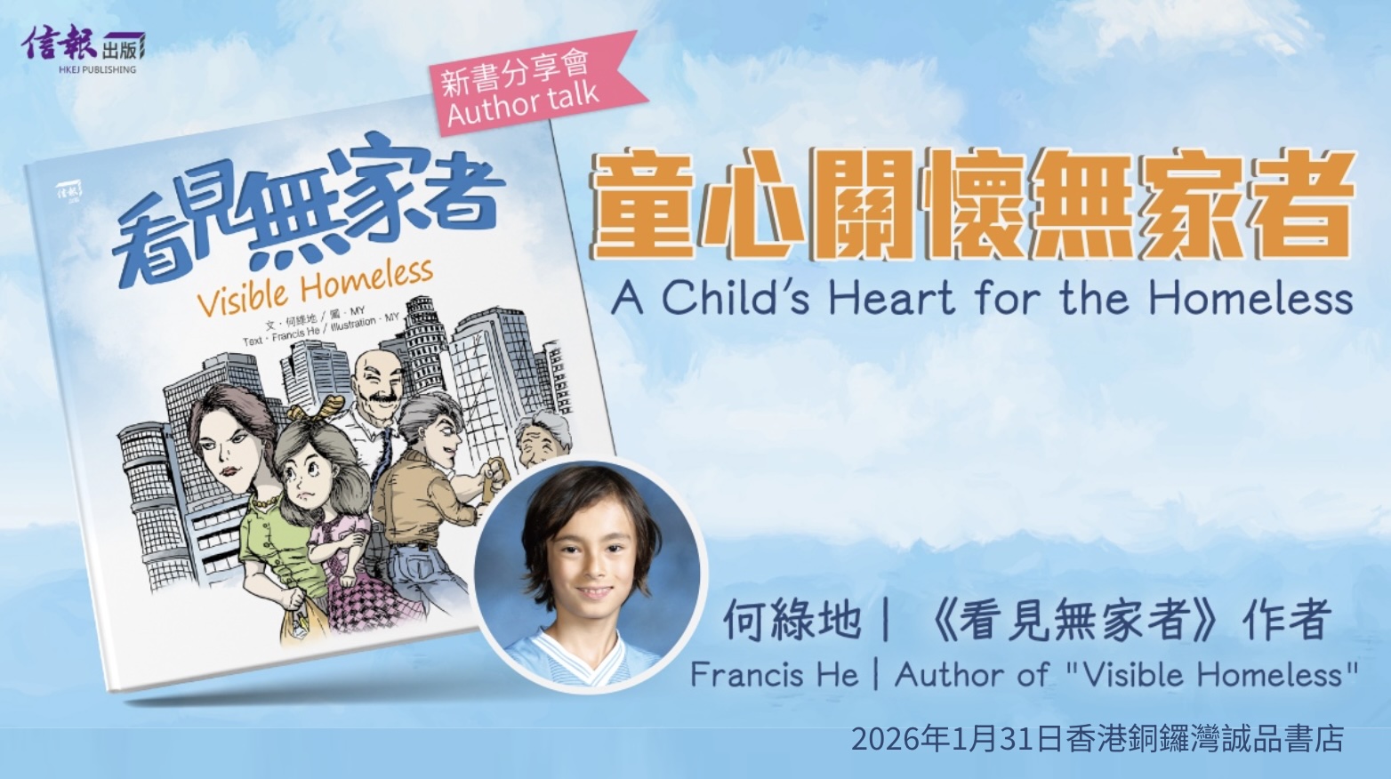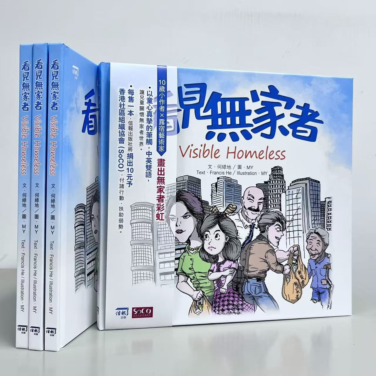 Francis He is a student at Hong Kong International School (HKIS) who is passionate about caring for and helping others. Since Grade 3, he has been an active member of the HKIS Service Club, taking part in community service and learning firsthand about the realities faced by people experiencing homelessness in Hong Kong. With the support of his teachers and classmates, Francis received the James A. Handrich Service Leadership Endowment Fund for three consecutive years. He used these resources to lead school activities that provided food and daily supplies to people in need, create a website titled Visible Homeless to raise public awareness, develop a digital game called Invisible No More, and ultimately complete this picture book. Through these efforts, Francis hopes to inspire more children to learn, care, and take actions to support people experiencing homelessness in Hong Kong.